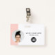Personalize facilmente este Crachá de Nome de Funcionário Minimalista de Negócios Horizontal Personalizado com Foto, Digitalizar Código Qr ou Digitalizar Código de Bar e logotipo comercial. Um simples design de negócios com fotos redondas, em cores cor-de-rosa e branca, cor-de-rosa-pincelada e branca, totalmente personalizável nos tamanhos frontal e traseiro, fontes básicas e modernas sans-serif e uma aparência profissional e clara. Disponível com jardim, clipe de metal ou com retratável. Sem ordem mínima.