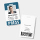 Personalize esses crachás de passe de imprensa vertical com uma foto e um nome de funcionário, juntamente com três campos de texto personalizados para nome de saída de mídia, título ou função, e número de ID ou datas válidas, juntamente com o logotipo da empresa de mídia. A tecla PRESS aparece na parte inferior em letras brancas em negrito para facilitar a identificação. Personalize com um código de barras na parte traseira, se necessário, juntamente com informações de devolução ou outros detalhes.