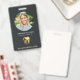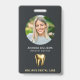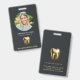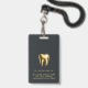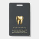 Crachá de identificação com foto moderna, profissional e elegante para consultório odontológico. Este design apresenta uma única foto, nome, título e nome da empresa na frente, complementado por um logotipo de dente de ouro em um fundo escuro. Personalize ainda mais o verso com seu endereço. Este crachá de identificação é perfeito para funcionários de consultório odontológico, oferecendo uma aparência sofisticada e coesa para sua equipe.