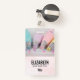 Crachá de nome personalizado com uma fotografia bonito colorida pastel. Apresentando artigos decorativos em azul pastel, rosa, pêssego e amarelo. Colocada sobre uma mesa de madeira com pequenas miçangas coloridas. Um fundo cor d'água cor-de-rosa com o seu texto personalizado escrito por cima.