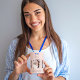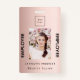 Um crachá para maquiadores, designers de unhas, estilistas de cabelo, designers, donos de salões de beleza. Um fundo de aparência metálica falsa rosa dourado. Adicione sua foto, título, logotipo da empresa, nome da loja. Voltar: seu texto. Eliminar o código de barras se não for necessário