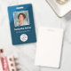 Personalize esses crachás verticais azuis de funcionários com uma foto de funcionário, logotipo da empresa, código de bar, ID e nome do funcionário.
