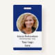 Personalizado funcionário, foto, código do Bar, logotipo, Crachá de nome Você pode personalizar este modelo adicionando sua foto, nome, profissão, logotipo da sua empresa e código do bar. Design simples profissional, azul e branco, com fotograma em círculo