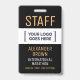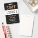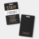 Este crachá de ID de funcionarios legal tem um design moderno para cartões de identificação, com um texto personalizável e o logotipo da empresa na frente e ( na parte traseira) um script de informação branco, tudo em fundo preto, para maior visibilidade. É simples mas versátil e pode ser adaptado a concertos desportivos ou a outros tipos de eventos. Disponível em variações de cor. Peça a sua agora!