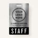 Funcionarios profissional moderno, crachá de identificação de funcionário ou de tripulante para sua empresa, evento, conferência ou convenção que apresenta o logotipo de sua empresa ou organização contra um fundo metálico falso prateado (você pode substituir esse fundo por sua própria imagem, se desejar). Adicione um nome e um título de cargo ou o evento e a data em tipografia simples.