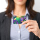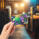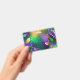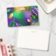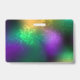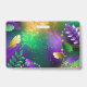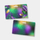 Fundo textural iridescente de mardi gras com manchas de roxo, amarelo e verde, decorado com penas fofas e contas brilhantes. Feriado de mardi gras.