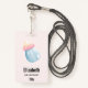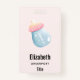 Crachá personalizado com uma imagem fofa de uma garrafa de bebê azul-clara com uma jante rosa.