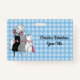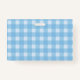Este nome ou crachá de identificação é xadrez azul e branca com três gatinhos giros vestindo arcos cor-de-rosa sentados com a mãe branca sorridente. Personalize seu nome e informações com os modelos.