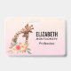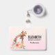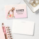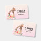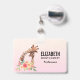 Crachá com um desenho fofo em aquarelas de uma mãe e girafa bebê. A girafa-mãe está descansando a cabeça sobre a girafa do bebê, amorosa e adorável. Bonito buquê rosa, amarelo, verde, de flor de aquarela colocado debaixo deste par de queridos. Um plano de fundo gradiente criado usando uma mistura de cor rosa suave em cor laranja de pêssego claro.