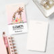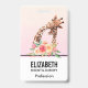 Crachá com um desenho fofo em aquarelas de uma mãe e girafa bebê. A girafa-mãe está descansando a cabeça sobre a girafa do bebê, amorosa e adorável. Bonito buquê rosa, amarelo, verde, de flor de aquarela colocado debaixo deste par de queridos. Um plano de fundo gradiente criado usando uma mistura de cor rosa suave em cor laranja de pêssego claro.