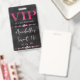 Este crachá de passe de acesso total VIP glamoroso apresenta um design cintilante e feminino em um fundo preto. O título VIP é impresso em uma fonte estilo folha de rosa, seguido pelo título do evento. Cordões de diamantes rosa separam o texto. O local e a hora da festa ou evento são impressos no verso. É perfeito para uma festa de aniversário, sweet 16, chá de noiva ou outra celebração elegante.