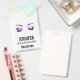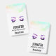 Um nome de etiqueta com uma bela ilustração pintada com aquarela. Bonito olhos roxos e sobrancelhas, olhos fechados mostrando longas e elegantes pinceladas. Uma borda abstrato ao longo do topo com cores verdes, azuis e cor-de-rosa irregulares.
