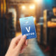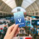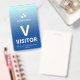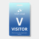 Crachá de visitante vertical com um simples design contra um gradiente de azul pálido a azul-céu. Um V branco grande facilita o reconhecimento rápido do visitante como tal. Personalize com o logotipo da sua empresa.