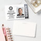Crachá de guarda de segurança profissional com foto de perfil e logotipo da empresa. Este modelo editável pode ser personalizado com uma foto, nome, cargo, número de identificação, empresa, data de validade, código de barras e logotipo para marcas. Um design moderno com faixas de gradiente e uma fonte limpa. Ele oferece texto totalmente personalizável para ajustado da marca de sua empresa. Ideal para vários locais de trabalho e funções, como guarda de segurança, oficial de proteção próximo, segurança privada corporativa, segurança de loja, guarda pessoal, porteiro oficial, equipe de eventos, assistentes de varejo, funcionarios médico, passe para pequenas empresas, nomes de etiqueta de conferência e muito mais! Cores impressas: preto, branco e cinza. Compre a coleção para obter ideias e suprimentos de produtos de segurança mais populares para venda on-line.