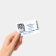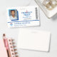 Crachá de ID do funcionário com um design minimalista limpo em azul, preto e branco, onde um quadro geométrico em azul-céu e azul profundo envolve a foto do seu funcionário. Adicione seu logotipo em dois lugares. Um menor ao lado do nome do local de trabalho, e um maior sob o nome e o título do funcionário. Uma camada branca transparente sobre o logotipo mantém-no esmaecido para que o texto fique visível. Adicione um código de bar e informações adicionais, conforme necessário.