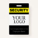 Este crachá personalizado de identificação de funcionário apresenta um logotipo de exemplo no centro que você pode personalizar para incluir o logotipo de sua própria empresa, empresa ou organização ou outra imagem personalizada. O título "SEGURANÇA" é impresso sobre ele em negrito e preto sobre um fundo amarelo. A faixa amarela ajuda a fazer a palavra Segurança se destacar e ser perceptível. Você pode incluir o nome da sua empresa ou texto de adição abaixo da imagem do logotipo, bem como um nome de funcionário. A parte traseira do crachá apresenta informações adicionais sobre funcionários ou empresas impressas sobre um fundo preto, com um código de barras de exemplo colocado na parte inferior. Você pode substituir o código de digitalização por sua própria imagem ou por outra imagem.
