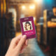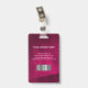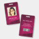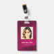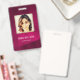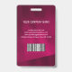 Cartão de identificação de foto comercial moderno com código de barras sobre fundo burgundy. Informações adicionais podem ser adicionadas à parte traseira deste crachá de ID de negócio