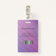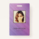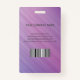 Cartão de identificação de empresa de fotografia moderno com código de barras sobre um fundo de faixas diagonais roxas e cor-de-rosa. Informações adicionais podem ser adicionadas à parte traseira deste crachá de ID de negócio