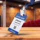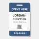 Crachá de ID de evento prático e sem rodeios personalizado com nome, empresa, cargo e código QR em azul escuro.