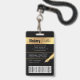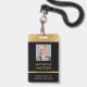Crachá de ID de Foto Moderno, preto e dourado, com espaço para uma foto de perfil personalizada, título do cargo, detalhes de contato, serviços e código de barras. Este crachá elegante de nome de funcionário apresenta fundo preto e efeitos falsos em ouro com texto e foto totalmente editáveis.