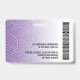 Versão horizontal com um padrão tribal roxo e branco Um design de negócios moderno que destaca o logotipo do seu escritório e o nome do funcionário. Esta tendência de design de pequenas empresas também inclui um número de ID de crachá, data de expiração e uma grande área para enfermeira, essencial ou qualquer posição. VOLTA: você pode adicionar um código de bar de digitalização na parte traseira e um local para adicionar informações se o crachá for perdido. Você também pode mudar a cor do plano de fundo. Clique no botão personalizar e escolha uma cor de fundo para a frente e para trás.