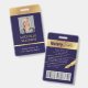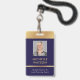 Crachá de ID de Foto Moderno em azul e ouro marinho com espaço para uma foto de perfil personalizada, título do cargo, detalhes de contato, serviços e código de barras. Este elegante crachá de nome de funcionário apresenta fundo azul escuro e efeitos dourados falsos com texto totalmente editável e uma foto.