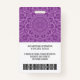 Orquídea Roxa e Padrão de Mandala Branca - Um design de negócios moderno que destaca os logotipos de seu escritório e o nome do funcionário. Este design do escritório de tendências também inclui um número de ID do crachá, data de validade e enfermeiro ou outro título. VOLTA: você pode adicionar um código de bar de digitalização na parte traseira e um local para adicionar informações se o crachá for perdido. Você também pode mudar a cor do plano de fundo. Clique no botão personalizar e escolha uma cor de fundo para a frente e para trás.