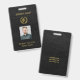 Crachá personalizado de fotografia de um funcionário do salão de barbeiro em um elegante fundo de couro preto com tesoura dourada falsa e logotipo de wreath laurel e script de tipografia. +++++++++ Fácil de personalizar com seu nome de empresa, logotipo, foto de funcionário, nome e título e seu texto no verso. +++++++++++++ Adequado para homens de luxo elegantes, salão de salão de salto, loja de homens ou qualquer outra atividade profissional exclusiva elegante.