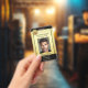 Crachá para identificação de fotos com sua foto e logotipo personalizados em um design dourado e preto. No verso, você pode adicionar um código de bar personalizado e/ou código QR e textos adicionais (ou excluir os modelos).