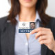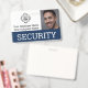 Este crachá de identificação personalizado apresenta um título de "SEGURANÇA" na parte inferior sobre um banner azul. Um exemplo de foto de guarda de segurança é colocado à direita, que você pode personalizar para incluir seu próprio ID de foto. Um exemplo de logotipo de empresa ou de empresa é colocado à esquerda, seguido de um nome de funcionário e de empresa.