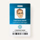Cartões de identificação de funcionário do Blue Manager com o logotipo e o código de barras da empresa.