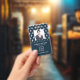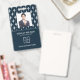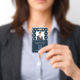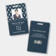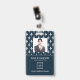 Cartão de identificação de empresa de fotos moderno com código de bar sobre cor damasco francesa branca em azul. Informações adicionais podem ser adicionadas à parte traseira deste crachá de ID de negócio