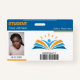 Crachá azul e laranja para estudantes do ensino básico, universitário ou universitário. Personalize as cores, texto e imagens para personalizá-las para sua escola. Mude os títulos para criar crachás para professores, professores, orientadores etc.
