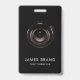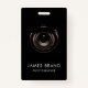 Um crachá moderno de identificação para fotógrafos mostrando seu nome e cargo, assim como uma lente de câmera em fundo preto. Ideal para fotógrafos que gostariam de se identificar como tal durante eventos de trabalho.