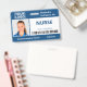 Mantenha o seu hospital ou prática médica seguro com crachás de identificação personalizada horizontal com foto, nome, cargo, número de identificação e código de barras do seu funcionário, bem como o logotipo e o nome da empresa. Você também pode incluir um departamento, se quiser. Perfeito para uma enfermeira ou outro funcionarios. Na parte traseira você pode adicionar mais informações, como por exemplo, onde devolver o crachá se ele se perder. Personalize-o com uma foto, qualquer logotipo de forma, código de barras e texto personalizado na barra lateral. A foto quadrada à esquerda tem uma borda branca fina rodeada por listras azuis na parte superior, inferior e linhas azuis finas pelos lados. Um bloco branco no lado direito central destaca o título do trabalho e o número de ID no texto azul escuro e o código de barras. O nome do funcionarios e o texto do hospital ou da empresa são brancos em azul. Seu logotipo está na parte superior esquerda, em azul, de modo que os logotipos brancos ou de cores claras funcionarão melhor.