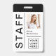 Este crachá de identificação da empresa moderno e atraente para o seu funcionarios é muito mais atual e na moda do que qualquer crachá de ID antigo! O design preto e branco apresenta uma tipografia grande e ousada, com um arranjo minimalista de linhas e espaço para a foto de seu funcionário, bem como um ponto para o logotipo de sua empresa ou evento. A parte traseira do crachá tem espaço para informações adicionais, se necessário. Este crachá é profissional o suficiente para a sua conferência corporativa ou profissional ou escritório padrão, mas atualizado o suficiente para o seu entretenimento ou evento musical ou funcionarios e segurança de concertos.