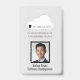 Crachá vertical de identificação de funcionário com fundo cinza claro e foto do funcionário emoldurada. Todos os elementos são mutáveis ou removíveis. Os elementos da frente do crachá incluem: logotipo da empresa, slogan da empresa, foto do funcionário, nome do funcionário, departamento do funcionário. A parte de trás do design tem informações da empresa, instruções "se encontrado" para devolução à empresa e código de barras de segurança, todos personalizáveis. Também disponível na orientação horizontal. Fenda na parte superior para cordão. Todos esses elementos podem ser alterados ou excluídos.
