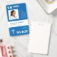 Tipografia moderna crachá de identificação personalizado azul de enfermeira(o) de centro médico ou hospital com tipografia em negrito, código de barras e logotipo. +++++++++++ Modelo fácil de personalizar com sua foto e detalhes em ambos os lados.