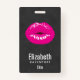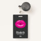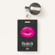 Crachá de nome personalizado com uma ilustração com lábios rosa-quente. Imagem brava e vibrante. Colocado sobre um fundo preto manchado.