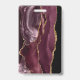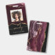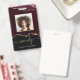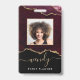 Este crachá de identificação de chic apresenta uma coloração aquosa em vermelho burgundy com brilho de ouro falso com um toque de preto com sua foto personalizada colocada dentro borda de matiz dourada e seu nome e título na parte inferior. Perfeito para estilistas de cabelo e artistas de maquiagem!