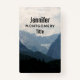 Um nome de etiqueta com uma fotografia de belas montanhas, céu nublado e colinas rolantes cheias de árvores em primeiro plano. esquema de cor azul da cinza.