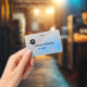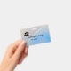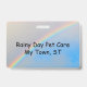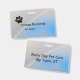 Pawprint no canto superior esquerdo, com corte arco-íris de canto a canto abaixo. A frente mostra Nome e título, parte traseira (menos impressão de pata) mostra o nome comercial e o local.