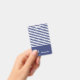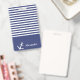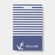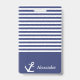 Distintivo listrado azul marinho e branco pode ser personalizado com o seu nome. Uma âncora branca está ao lado do seu nome. Acima do nome estão listras horizontais azuis e brancas.