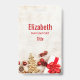 Crachá personalizado com uma fotografia rústica. Uma placa de madeira castanha clara com vários elementos de Natal ao longo da parte inferior.