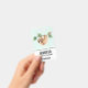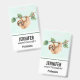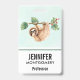 Nome crachá com uma preguiça adorável pendurada de cabeça para baixo de um galho de árvore. Ramo de árvore é decorado com folhas e bagas tropicais. Colocado sobre um fundo verde-claro.