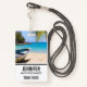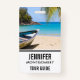 Nome crachá com uma cena de praia tropical idílica. Água clara de cristal azul turquesa e uma praia arenosa castanha macia. Algumas folhas de palma penduradas de cima. Um velho barco a remo de madeira fica sentado na praia. Uma paisagem serena e pacífica.