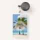 Um nome de etiqueta com uma bela e tranquila fotografia de duas palmeiras sob um céu azul brilhante. Em pé numa praia tropical isolada com água turquesa calma.