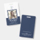 Este crachá vertical minimalista na cor azul-marinho pode ser personalizado com as fotos e nomes dos seus funcionários. Você também pode adicionar texto personalizado para número de identificação do funcionário, cargo, localização e mais. Seu logotipo pode ser inserido na parte superior do design.