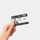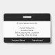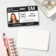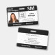 Crachás personalizados horizontais de identificação de fotos apresentam a foto, o nome, a abreviação profissional do cargo e o título do cargo, o número de identificação, o logotipo e o nome da empresa. Você também pode incluir um departamento, se quiser. Perfeito para qualquer profissão. Na parte traseira, você pode adicionar mais informações, como por exemplo, onde devolver o crachá se ele se perder. Personalize-o com uma foto, qualquer logotipo de forma e texto personalizado na barra lateral. A foto quadrada à esquerda tem uma fina borda branca rodeada por faixas pretas no topo e no fundo e linhas pretas finas pelos lados. Um bloco branco no lado direito central destaca o logotipo, o título do job, o número de ID e a data de expiração em texto preto. O nome do funcionarios, as iniciais do trabalho e o texto do hospital ou do negócio são brancos a preto.
