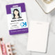 Crie seus próprios crachás e etiquetas de identificação personalizados para funcionários usando um modelo moderno vertical fácil de adicionar sua própria foto, logotipo da empresa, código de barras e outras informações importantes. Um design empresarial simples em roxo e branco & nome e título com código de barras. Sem pedido mínimo.